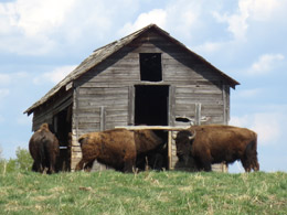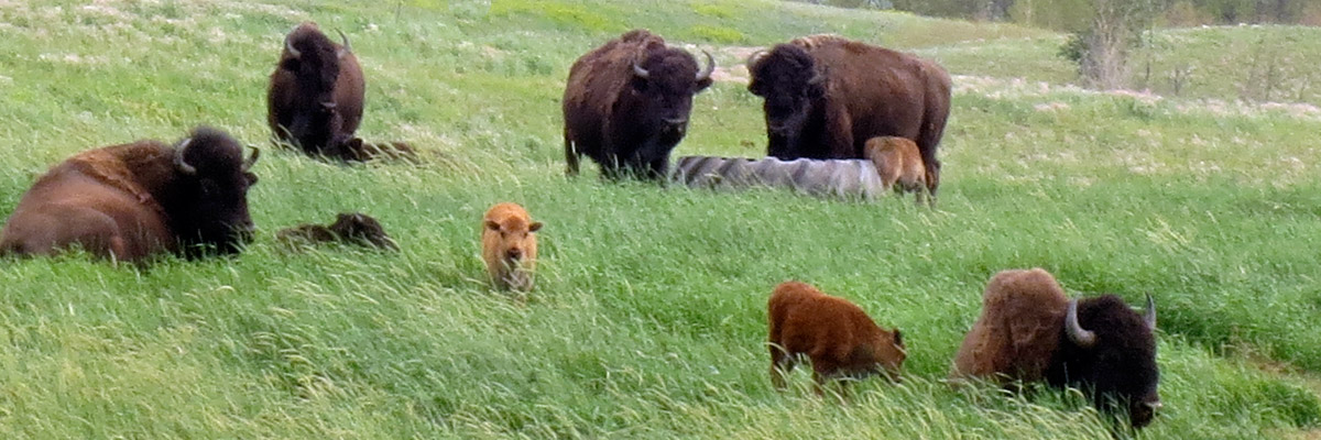 We raise our cattle and bison humanely for the beef and bison meat market. We calve in May and June when the weather is warmer and the sun shines late into the evening. We background our calves and grass finish a few calves for ourselves and a select market. Grass -fed cattle and bison have significantly more CLA conjugated linoleic acid in the meat. CLA is a good fat. We prefer a grass-fed, leaner meat and select and feed to achieve it.